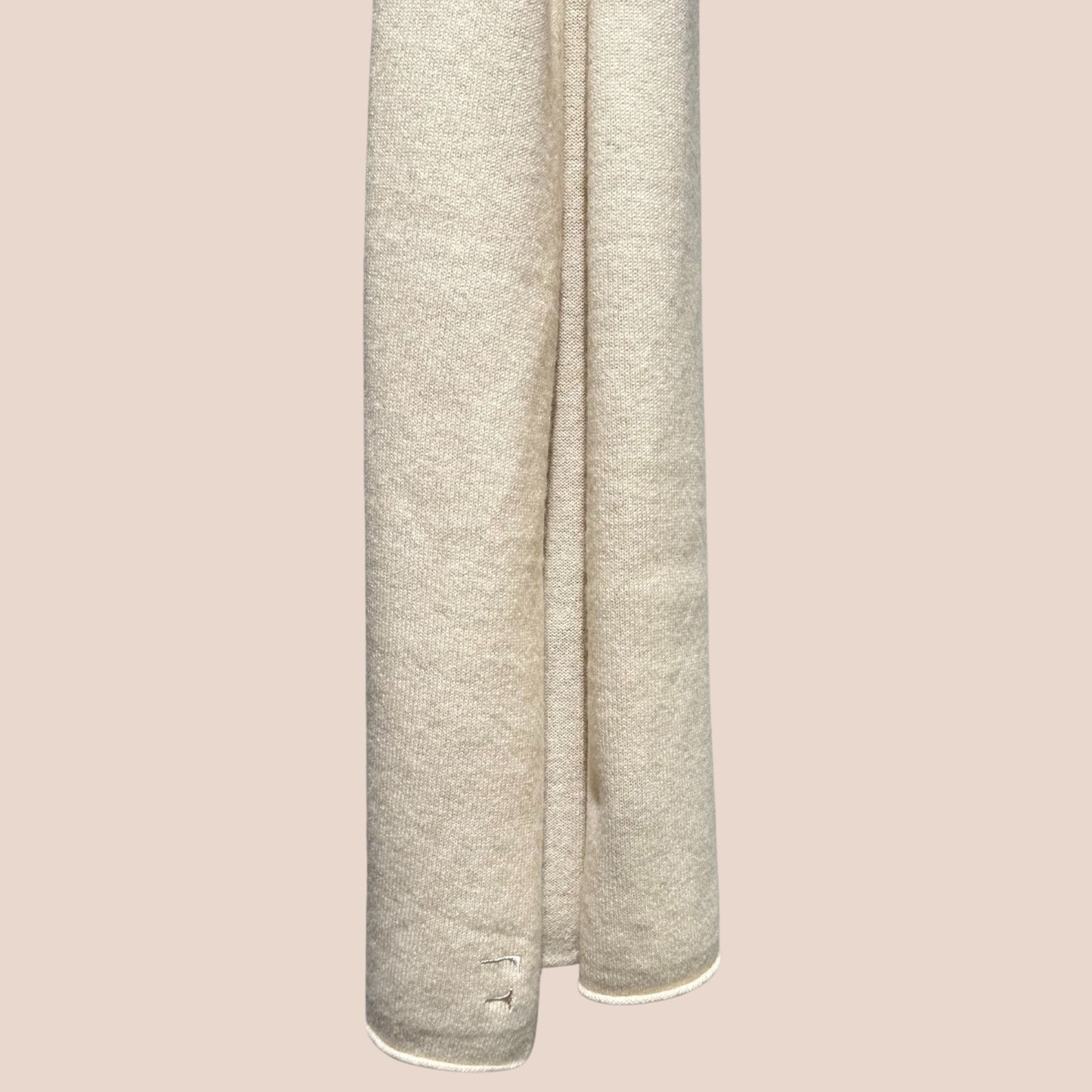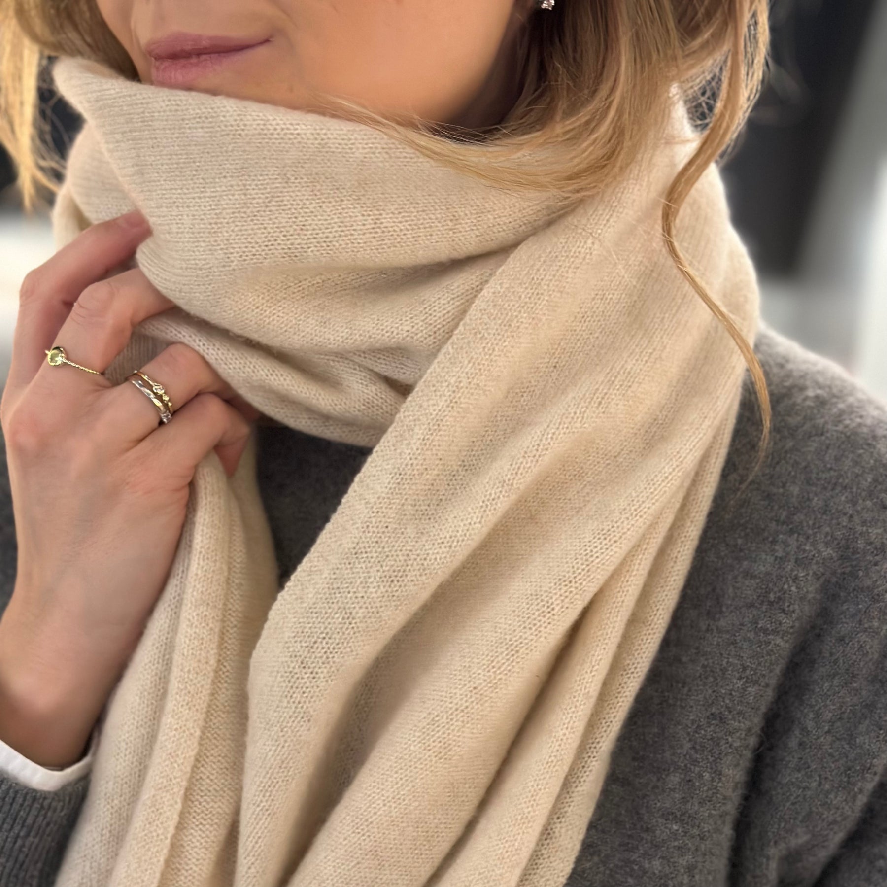 Elegant og tidløst skjerf i kremfarget kashmir. Skjerfet er laget i 100% ren kashmir, det mykeste naturmaterialet. Kashmirull er et pustende materiale som er supermykt mot huden og holder deg god og varm. De nøye tilpassede målene er med på å gjøre skjerfet perfekt, da det ikke vil bli verken for stort eller for tungt å ha på seg. Dette myke skjerfet er designet for å vare og blir garantert din nye favoritt i høst og vintersesongen🤍
