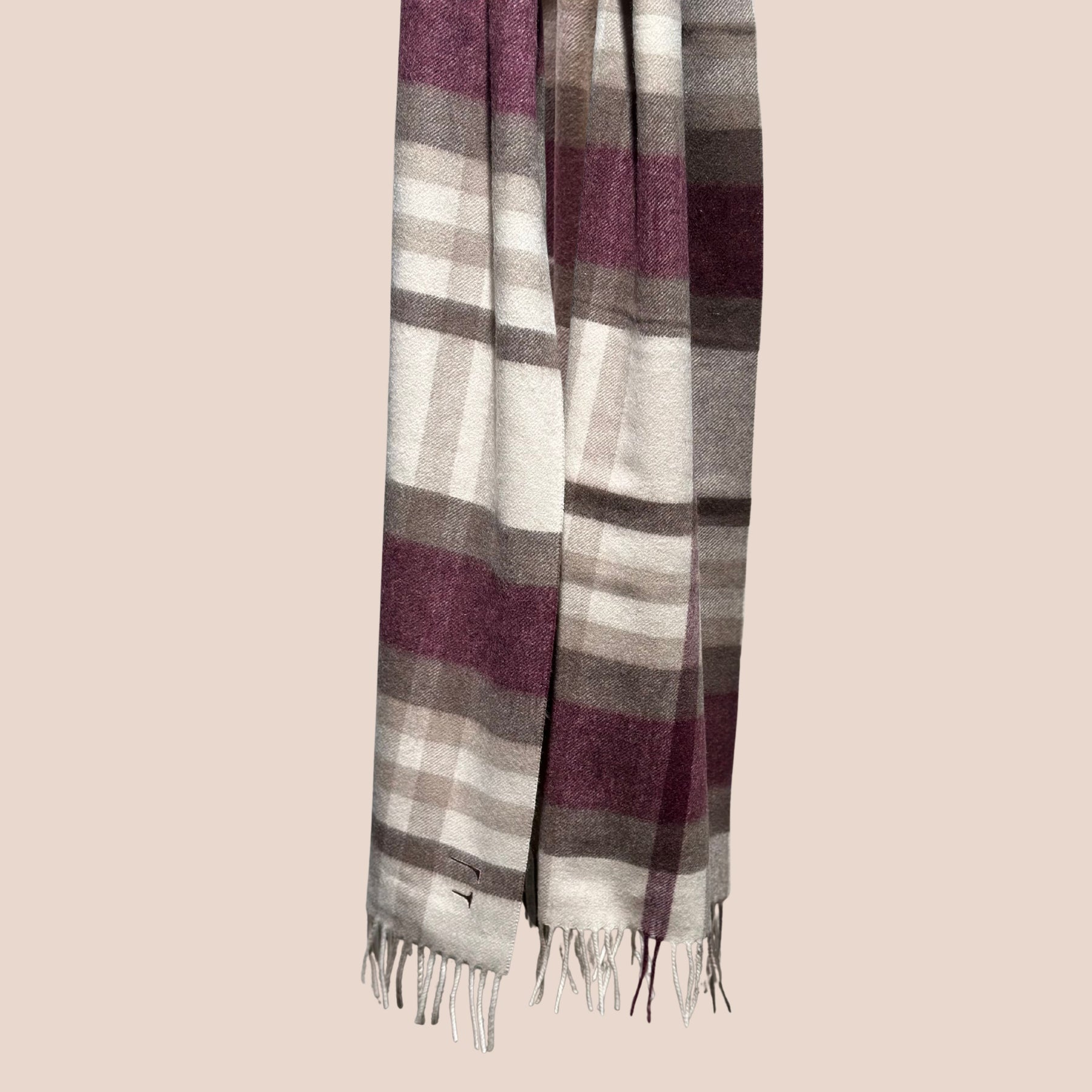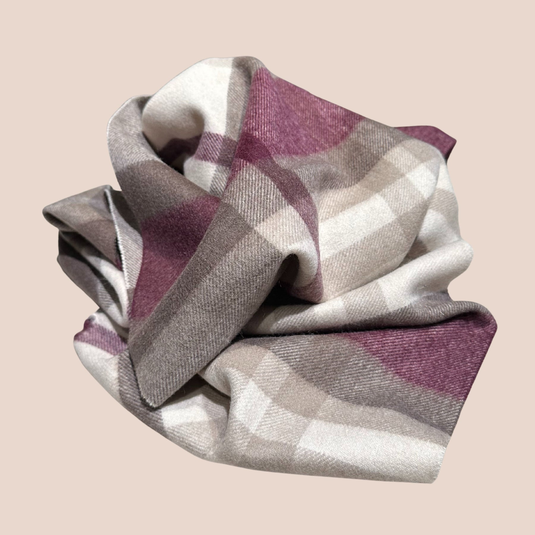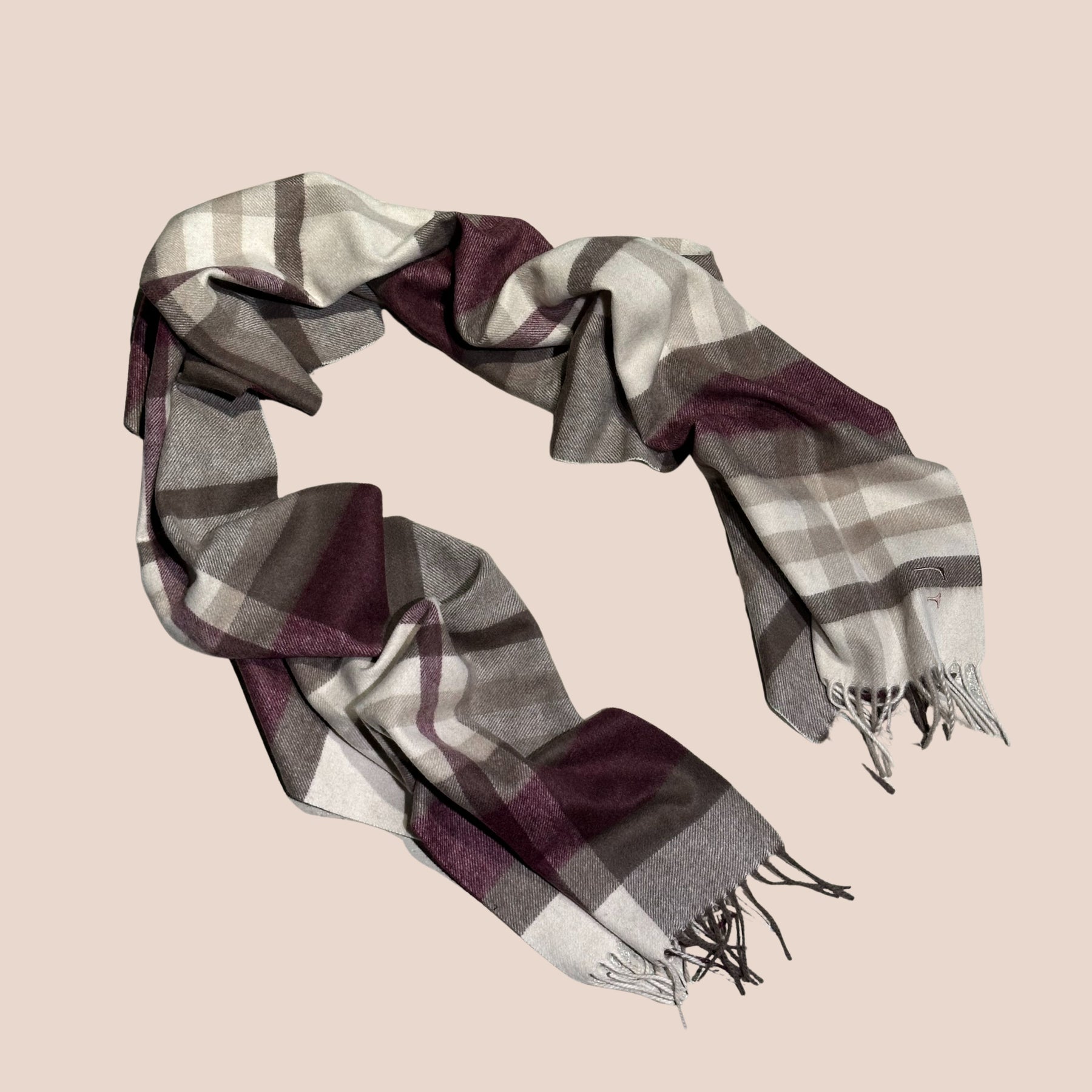 Elegant og tidløst skjerf i rutete kashmir i fargetoner av burgunder, beige, brunt og krem. Skjerfet er laget i 100% ren kashmir, det mykeste naturmaterialet. Kashmirull er et pustende materiale som er supermykt mot huden og holder deg god og varm. De nøye tilpassede målene er med på å gjøre skjerfet perfekt, da det ikke vil bli verken for stort eller for tungt å ha på seg. Skjerfet for deg som verdsetter kvalitet.