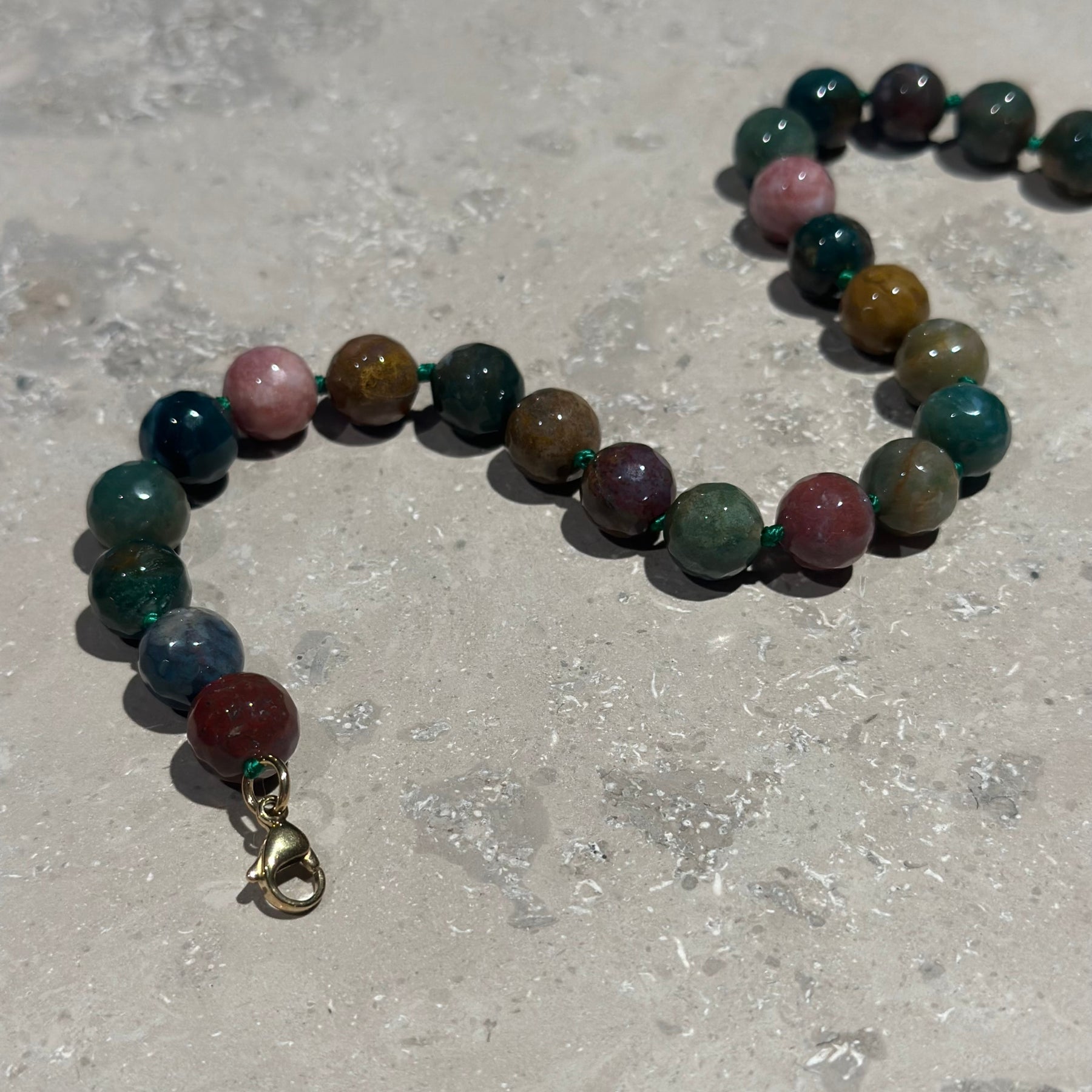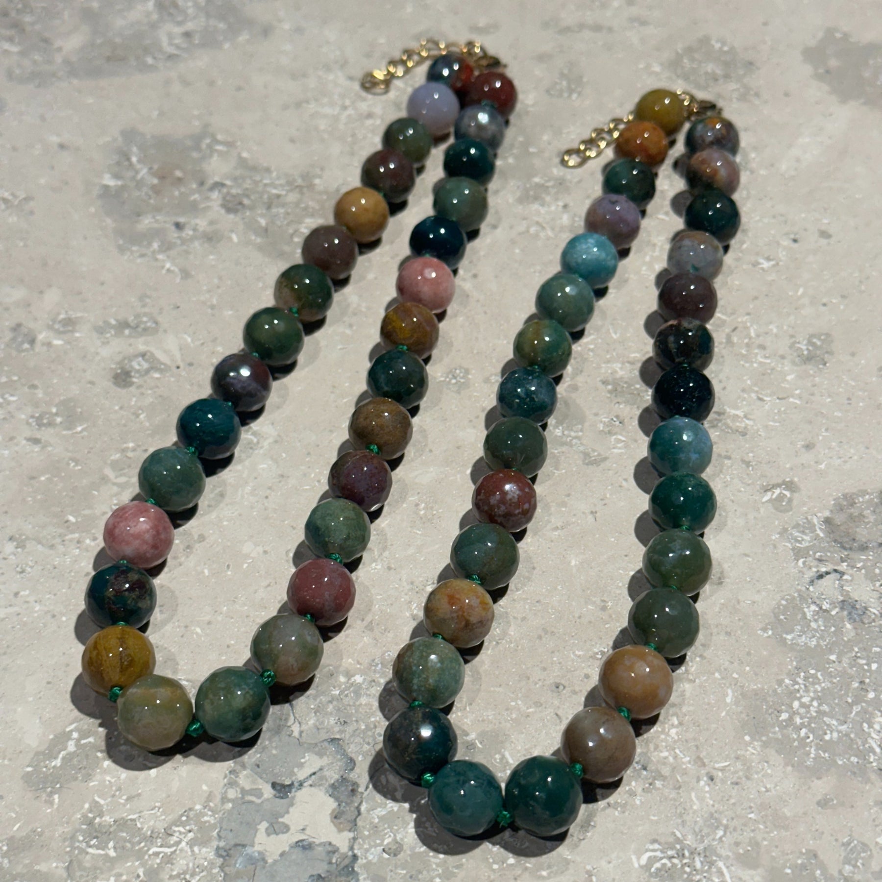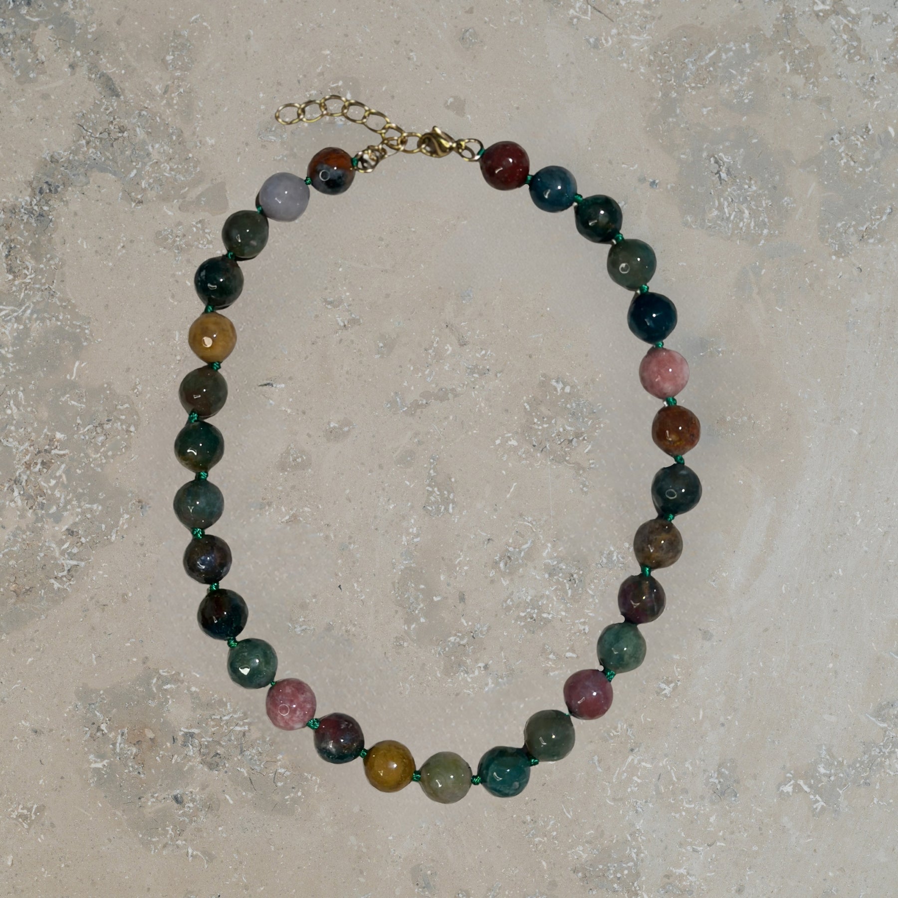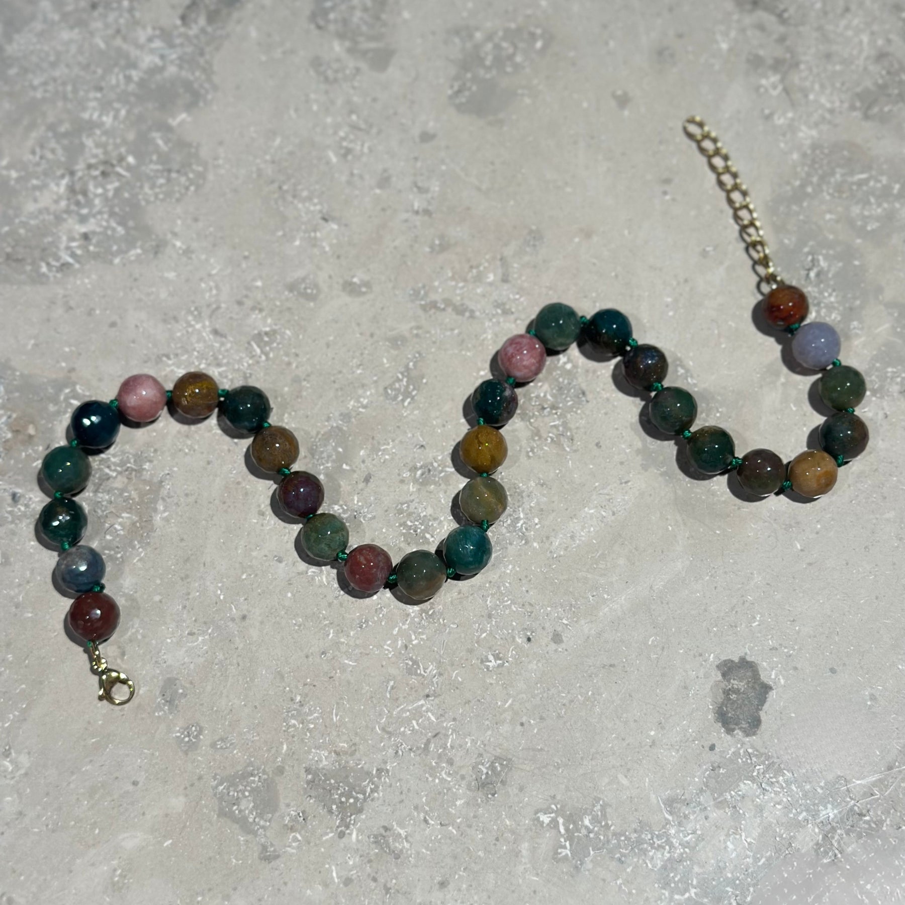 Halskjede med naturstener i India agat. Hver sten er slipt slik at de naturlig skinner når kjedet er i bevegelse. Vi bruker naturstener, noe som vil si at ingen stener er helt like. Dette gjør hvert eksemplar unikt og gir kjedet særpreg. Halskjedet er tredd med knute mellom hver sten for å beskytte stenene. Kjedet har gullfarget lås med justerbar lengde. Zoe halskjede gir antrekket det lille ekstra. Et trendy og elegant smykke som er designet for å vare og trives med i år etter år.